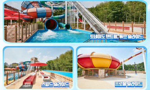 ● 스피드 슬라이드 : 두개의 슬라이드 형태 중 하나는 완만한 구간 및 수직낙하 구간이 섞여 있고, 하나는 약 70도의 수직낙하 슬라이드